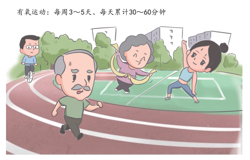 有氧运动:常见运动形式有快走、慢跑、骑自行车、跳秧歌舞、做广播体操和有氧健身操、登山、爬楼梯。建议每周 3~5 天、每天累计 30~60 分钟中等强度的有氧运动。最好坚持每天都运动。