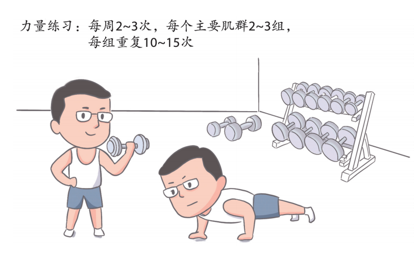可采用多种运动方式和器械设备,如俯卧撑、哑铃等,针对每一个主要肌群进行 2~3 组力量练习,每组力量练习以重复 10~15 次为宜。运动前需要热身,以免拉伤肌肉。不推荐老年人进行力量型运动,要量力而行。