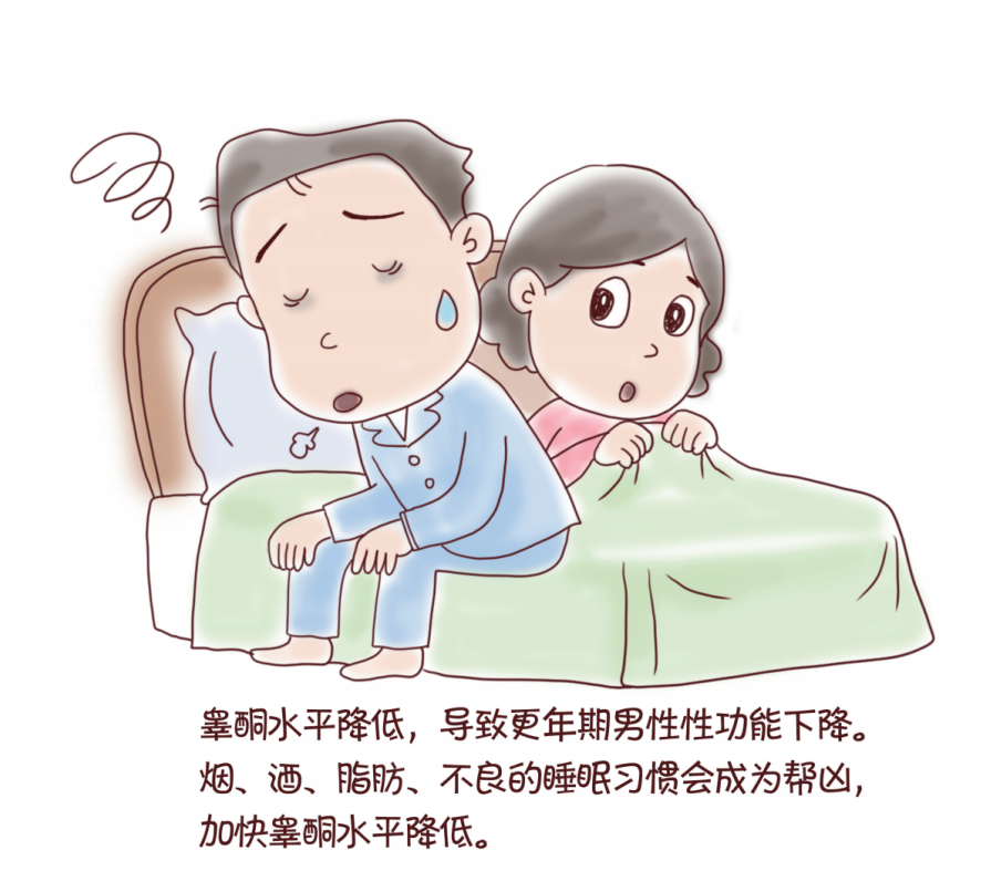 男性更年期综合征,专业的医学名称是“迟发性性腺功能减退症”。患者血液中睾酮水平降低,表现为性功能减退,包括性欲下降、晨勃或夜间勃起次数减少或消失,还可伴有体力下降、易疲劳、精神萎靡不振等症状,不仅降低生活质量,还会对许多器官的功能及心理健康造成不良影响。