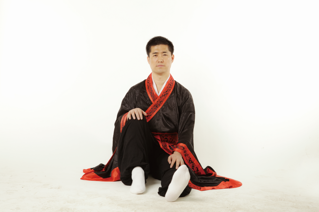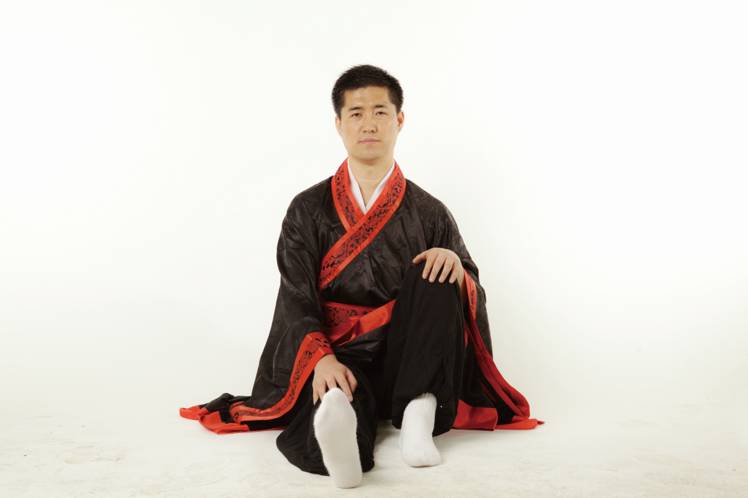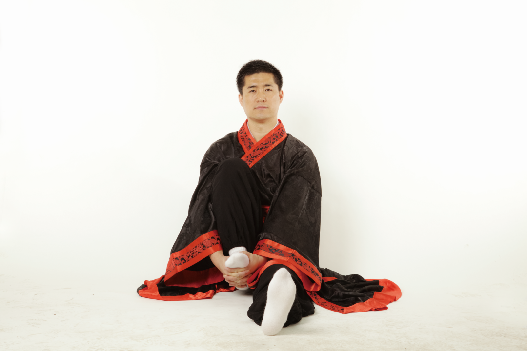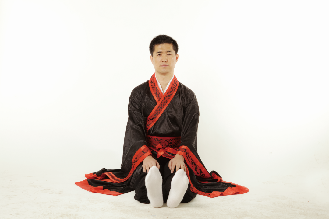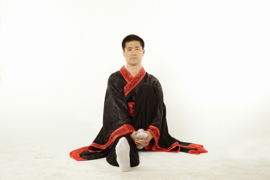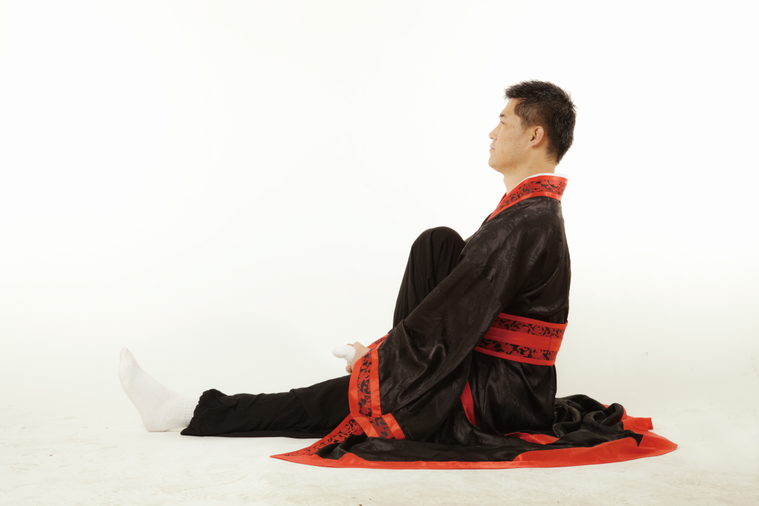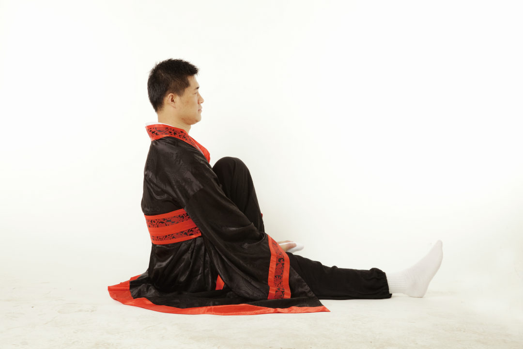 ● 5. 接上式,两手松开,右腿伸直,还原成正身平坐的姿势,呼吸调匀,全身放松。