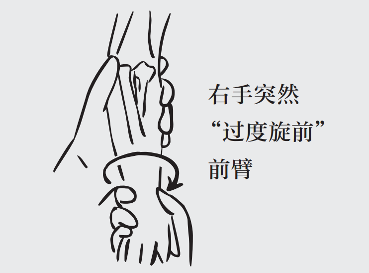 右手突然用力“过度旋前”旋转宝宝的前臂,这时通常按压在桡骨小头的大拇指会有明显的弹跳感,这表示桡骨小头已经复位。随后宝宝就可以自由的活动,并能屈伸肘关节。