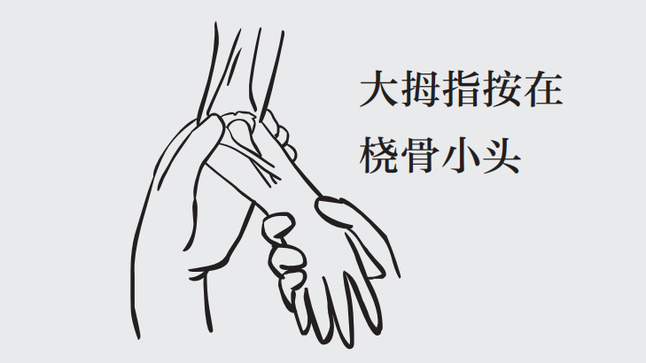 以右侧肘关节为例:复位时面对宝宝,右手托起并握住宝宝的前臂,将肘关节屈曲约 90°,左手掌拖住肘的内侧,大拇指按在桡骨小头的位置并施加一定的压力。