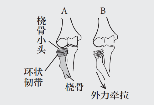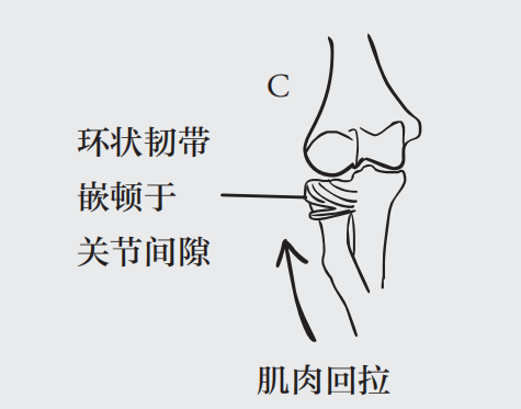 而环状韧带会滑过桡骨小头远端并嵌顿于关节间隙,从而阻止了桡骨小头恢复到原来的位置,于是造成桡骨小头半脱位。
