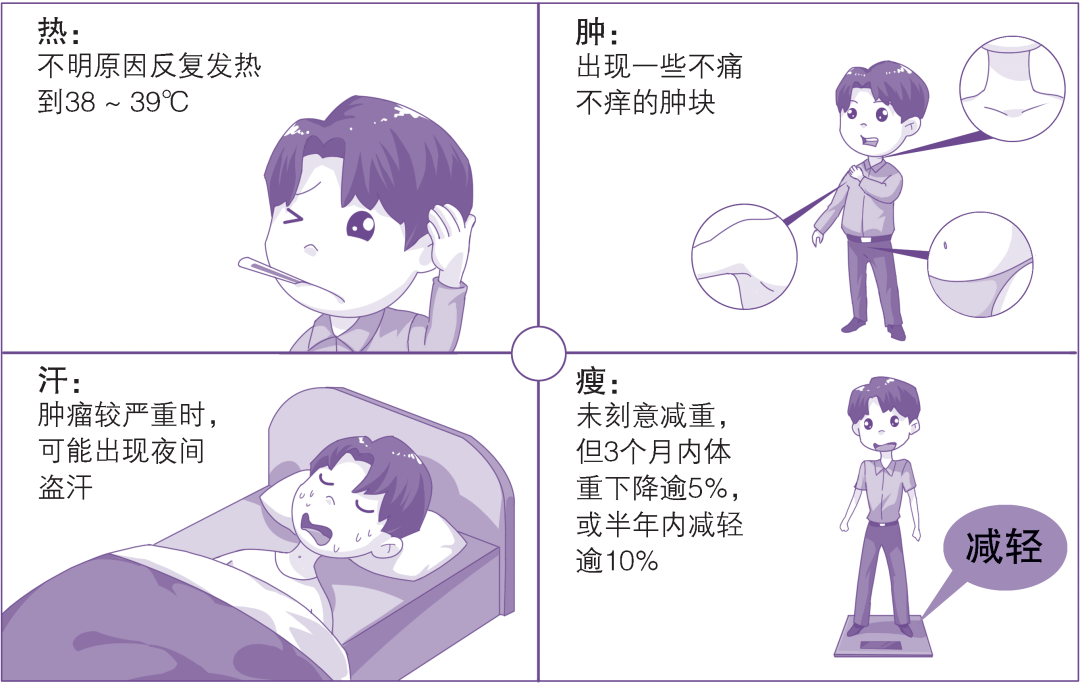 淋巴瘤善于“伪装”,早期往往没有特异症状,如出现这些症状:颈部、腋下、体表,包括口腔,出现一些不痛、不痒的肿块,或者伴有发热、畏寒、盗汗、体重减轻,要尽早就医。