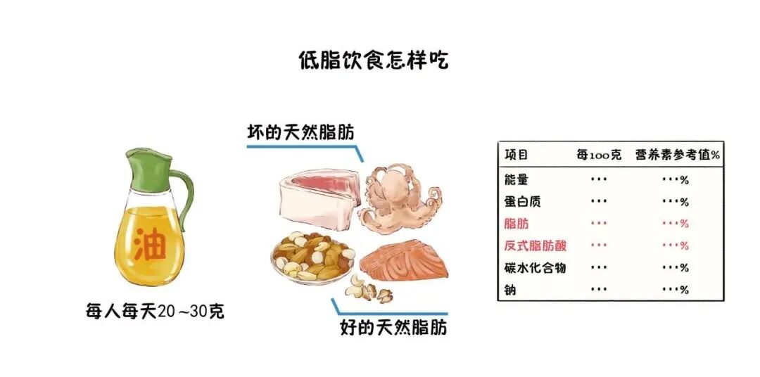 “低脂饮食”应该这样吃:烹调用油最好用限油壶控制在每人每天30g 以下;天然脂肪可以挑选坚果、深海鱼等;如果要吃加工食品,最好挑选营养成分表中不含反式脂肪酸的食物。