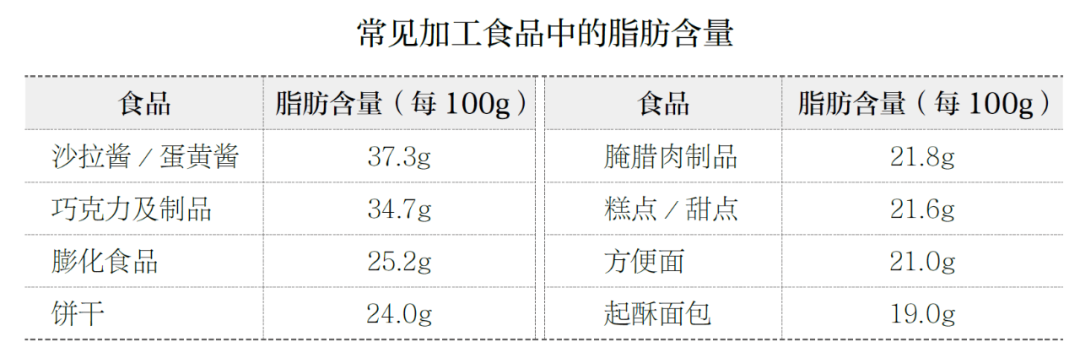 你知道吗?沙拉酱、巧克力、膨化食品、饼干、腌肉、甜品、方便面、起酥面包,这些食品的脂肪含量都在20% 以上,建议大家少吃或不吃。