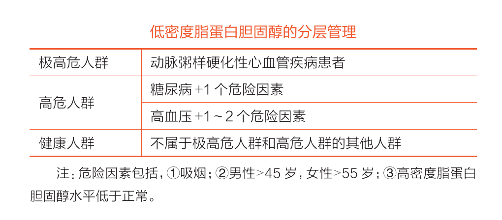 针对低密度脂蛋白胆固醇水平,医生一般会进行分层管理。极高危人群就是那些已经明确诊断为动脉粥样硬化性心血管疾病的患者,如得过心肌梗死、放过心脏支架、有过脑卒中等;高危人群是有糖尿病或者高血压,再加上1~2个危险因素;其他人暂属于健康人群。