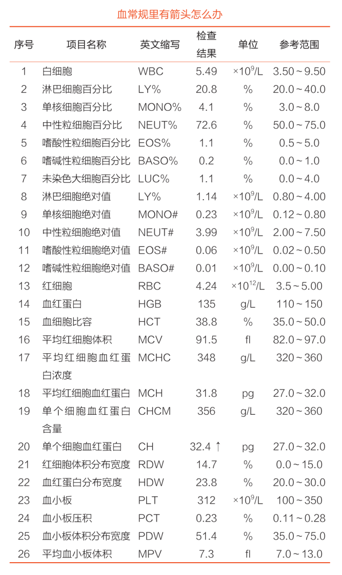体检报告中的血常规有二十多项,大家经常会发现自己的检查结果中有几项不在参考范围内,出现向上或者向下的箭头。有箭头就是有问题吧?其实不然。偷偷告诉你,对于血常规的化验单,医生一般主要看三项:白细胞、血红蛋白、血小板,如果这三项正常,其他有一两个箭头并不需要特别担心。所以即便血常规的化验单有箭头,但是只要这三项正常,那都不是事儿!当然,如果白细胞、血红蛋白、血小板这三项有了箭头,最好还是看医生。