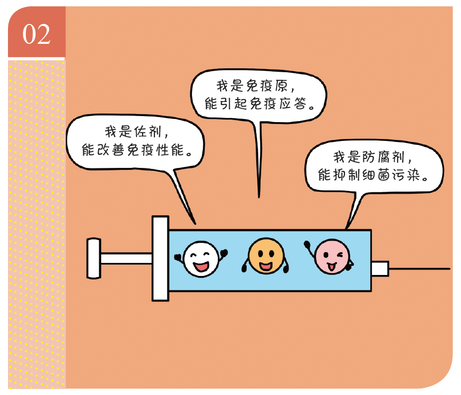 其中,溶剂的作用是使疫苗便于注射使用;佐剂主要改善疫苗的免疫性能;防腐剂抑制细菌的污染;保护剂则是为了保证疫苗在不同条件和温度下仍能维持安全和有效。