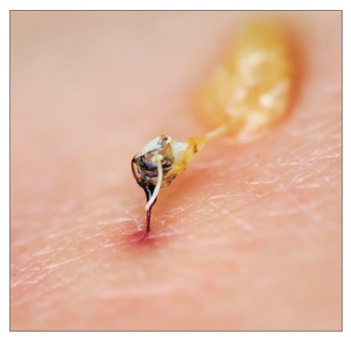 2. 用镊子清除毒针或毒毛。仔细检查伤口, 如果有刺留在伤口处,则应用镊子捏紧毒刺拔出或用火罐或者吸引器吸出,切不可直接用手指捏拿,因为刺上的毒液有可能进入皮肤更深处。切忌用手抓挠蜇伤部位。
