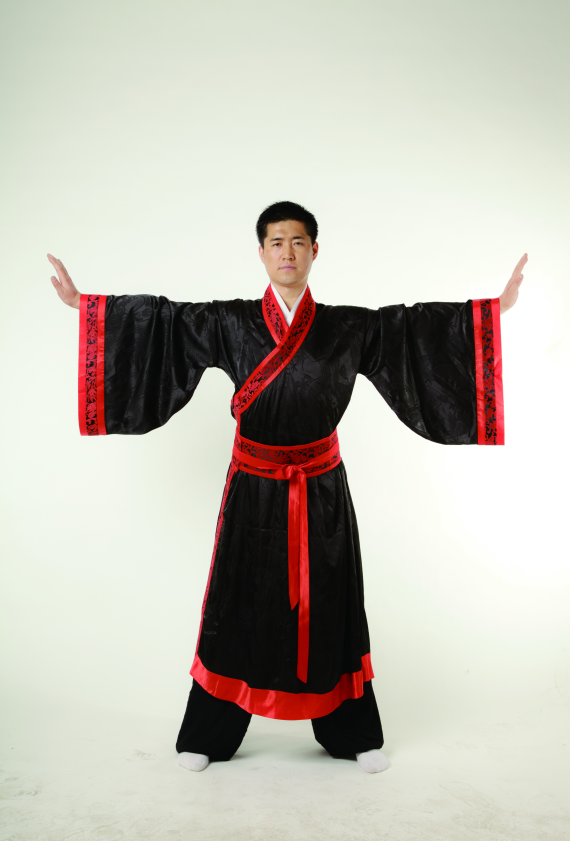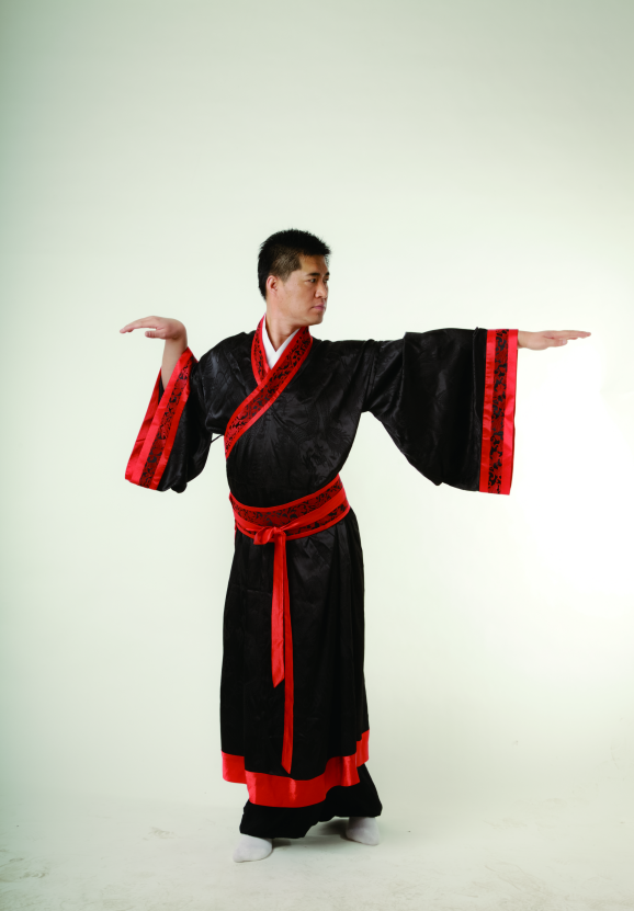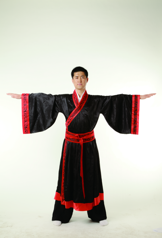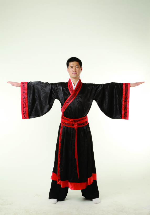 ●接上式,右脚向右侧开步,成“一字裆”,同时两臂侧伸成“一字势”,头颈转正,目视前方。