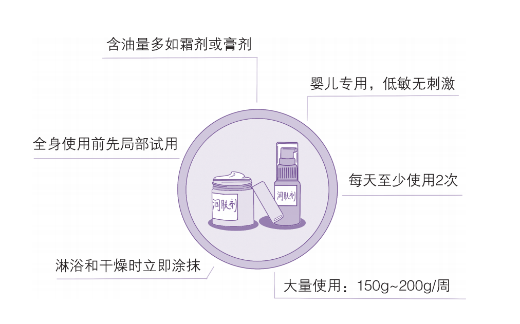 2. 选择适宜的润肤剂,充分润肤,维持正常的皮肤屏障功能。