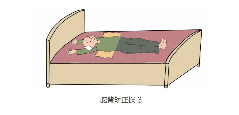 3. 仰卧床上,在驼背凸出部位垫上 6 ~ 10 厘米厚的垫子,全身放松,两臂伸直,手掌朝上,两肩后张,保持仰卧 5 ~ 10 分钟,每日做 2 ~ 3 次。