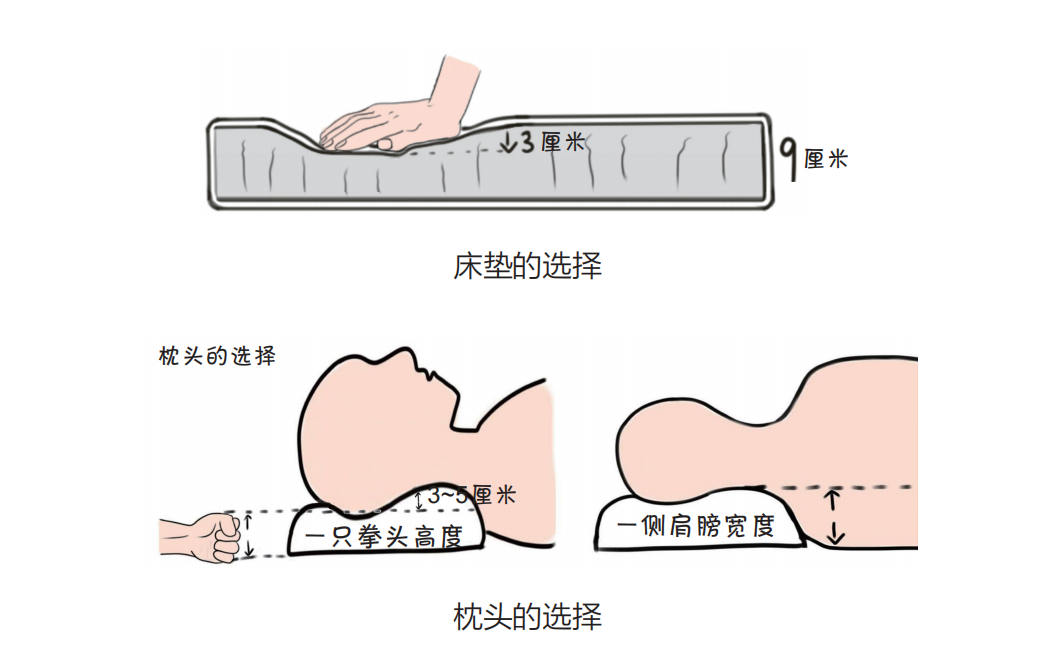 建议选择硬板床,选床垫按照 3 ∶ 1 的原则,例如床垫厚度为 9 厘米,手压下陷 3 厘米,这样的床垫比较合适。枕头高低适宜,平躺时,支撑头的地方压缩后,大约是一个拳头高度(5 ~ 7 厘米),支撑脖子的部分,要再高 3 ~ 5 厘米;侧睡时,支撑脖子的部分,最好和一侧肩膀的宽度等高,以保持人体脊柱处于正常的生理状态。