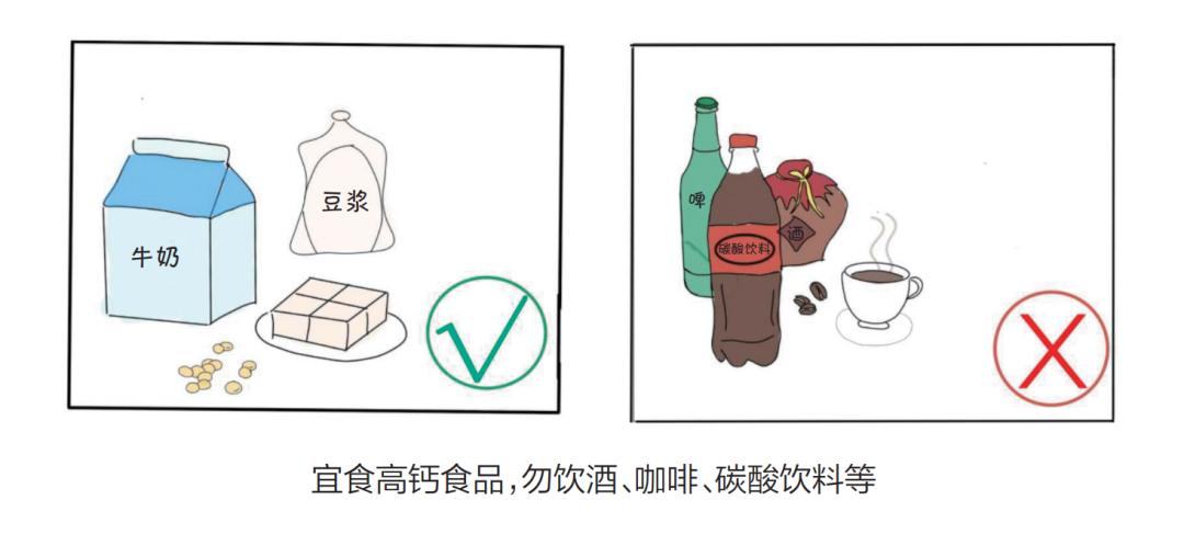 多食含钙量高的菜品,适当补充钙质。如各种豆制品和豆类,每天喝一瓶牛奶、一碗豆浆等。勿过量饮酒、咖啡、碳酸饮料等。