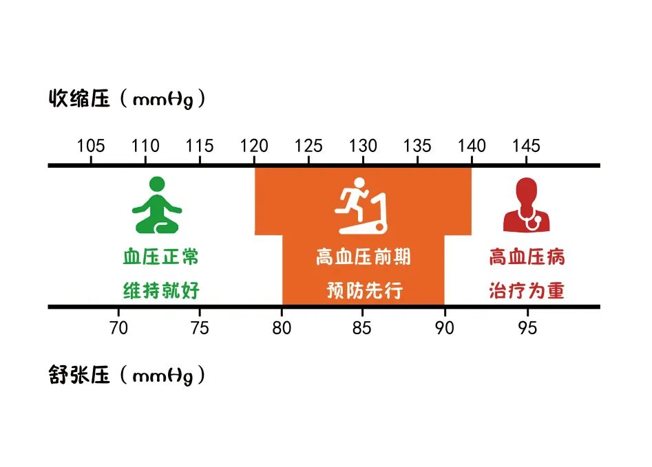 当 收 缩 压 在 120~139mmHg, 舒 张 压 在 80~89mmHg 时,称为“高血压前期”。高血压前期将逐渐发展为高血压,而且高血压前期人群发生心血管事件风险较大。应该采取防控措施,先控制饮食和加强锻炼,必要时,依据医生的评估和指导进行药物干预。“血压比正常值高”,你就要给予高度重视了!