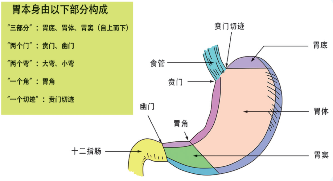胃有入出两个口:入口叫贲门,防止胃液反流入食管,出口叫幽门,防止肠液反流至胃,两者协同控制食物向下运送的速度。此外,胃的构成可以参考下面这张图片。