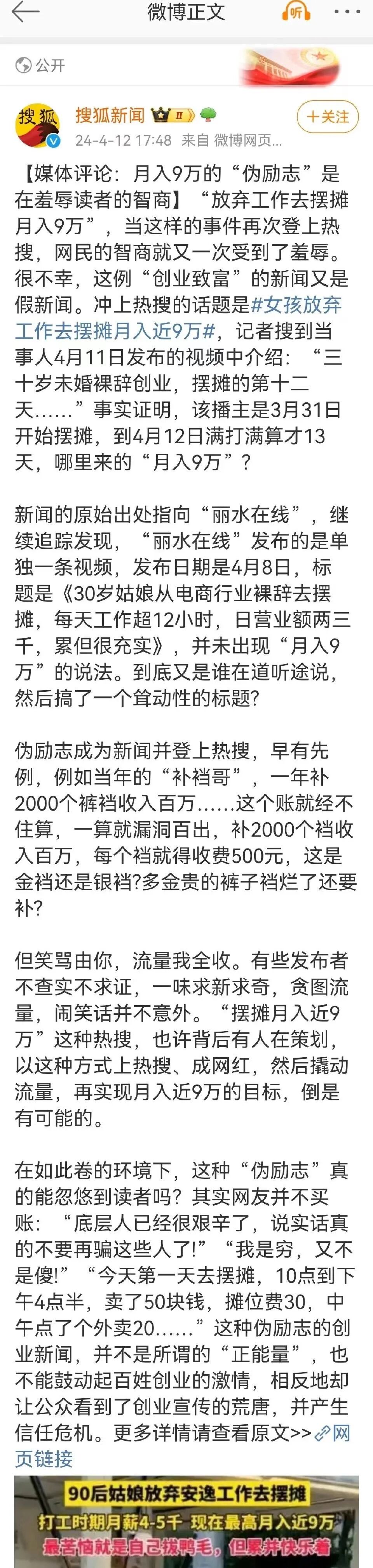 翻车到其他的媒体,也都不忍卒读,不得不下场辩论几句,月入九万的伪励志是在羞辱读者的智商,一共摆摊只有十二天,月入九万的励志报道就出来了。