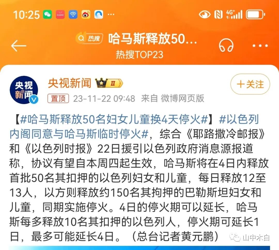 且,我所有的取材大都其实来自于咱们官方的信源,只是作为一个写作者固有的思维,可能看待一件报道的视角不一样。就譬如下面这个央视的报道,有的人看到的只是双方停火,有的人看到了最新进展,但我的视线是一下被释放的50多名妇女儿童触动到。这50多名被当为人质的妇女儿童,他们又是来自于哪里?又是如何被哈马斯抓为人质的?但他们,绝对是最普通最无辜的普通民众。