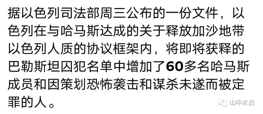 我还看到了以色列答应的释放群体。在以色列官方发布的文件上,以色列释放的人数更多,但300人的名单中,是哈马斯成员和以色列圣战组织的成员,以及一些被控谋杀和其他罪名的人。