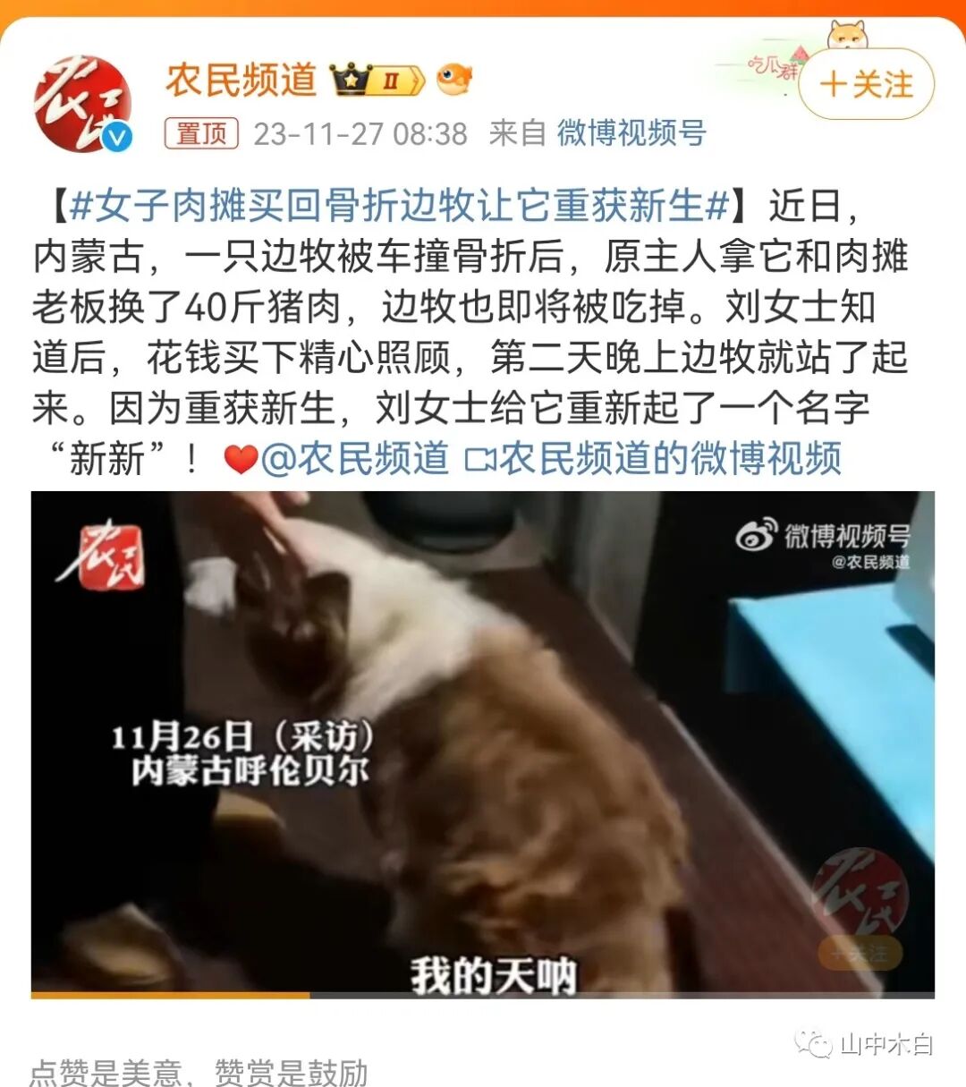 一个去买菜的普通女子,在经过肉摊时看到了这只边牧,而后花钱将其买下,精心的照顾下,一天之后这只边牧便能重新站了起来。因为这是边牧的又一次新生,女子给它起名“新新”。