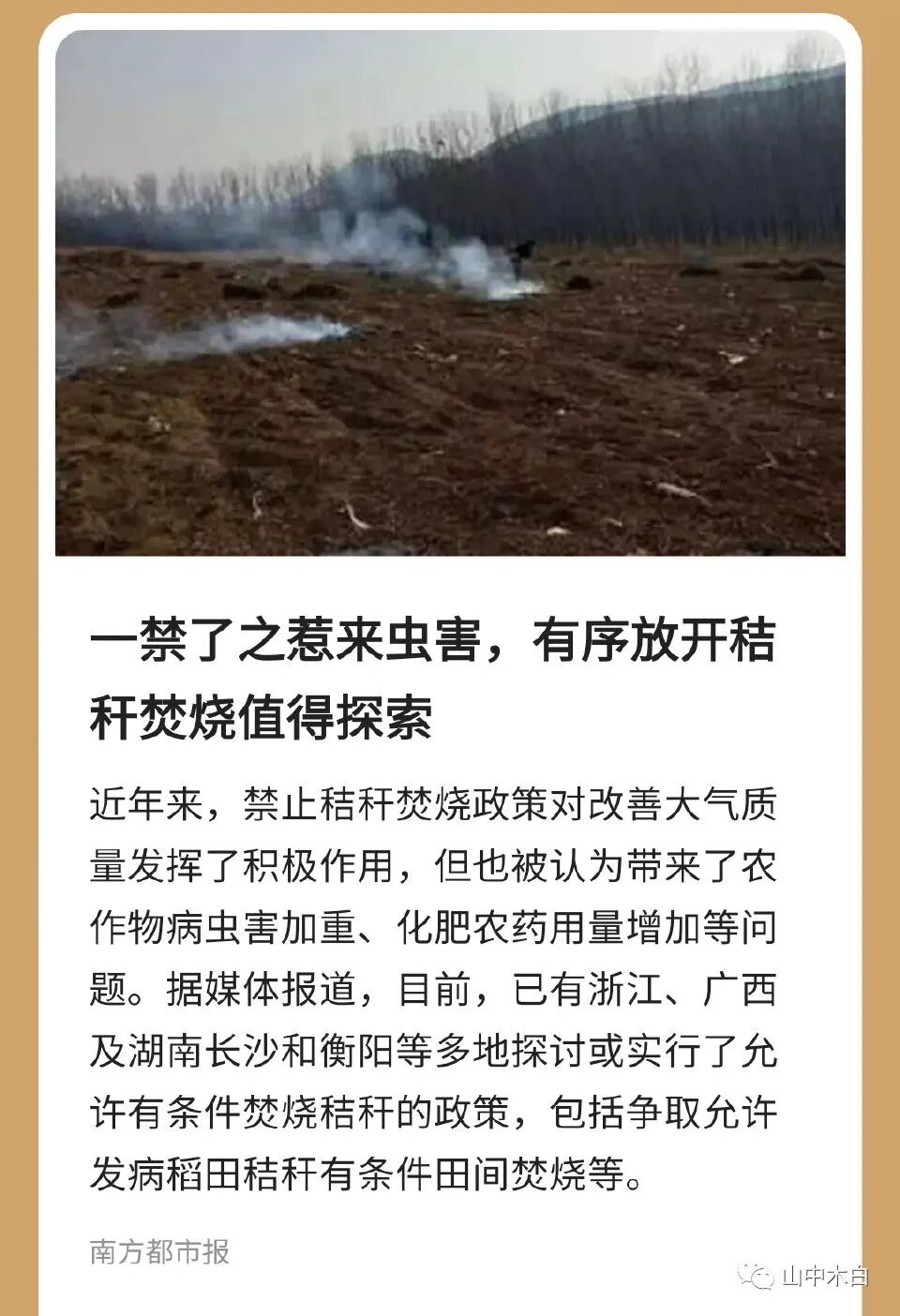 已经有两家媒体报道这件事了,说的是一些地方为了环境因素,不让焚烧秸秆,但也带来了农作物病虫加害的现象。如此导致的一个结果时,化肥农药用量增加了,而化学肥料的用量增加,导致的一个结果便是,人身的损害加大。看看这些年,人的抵抗力越来越差,很年轻的人也被查出癌症晚期,当然 这些目前还没有一个确切的科学论据,但一个事实是,人吃了化肥农药多的农作物,肯定会生病。