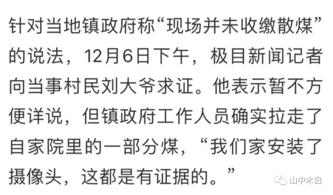 一是记者采访了当事老人 ,老人说,镇政府的人确实拉走了他的一部分煤,家里有监控的,这都是有证据的。
