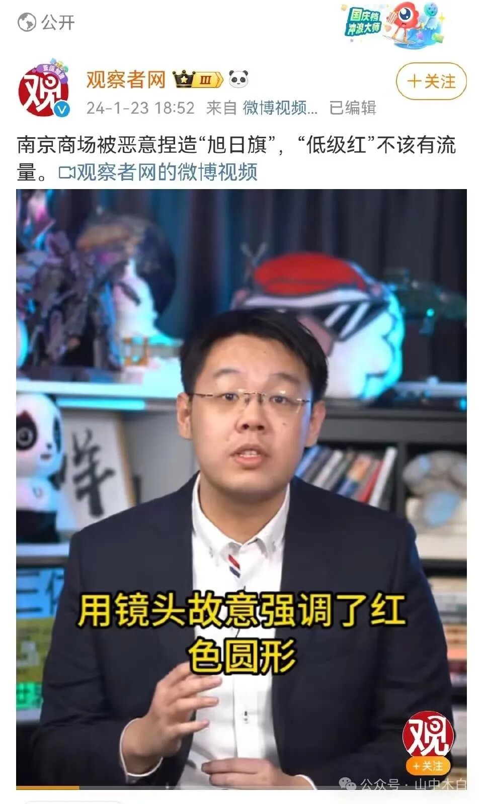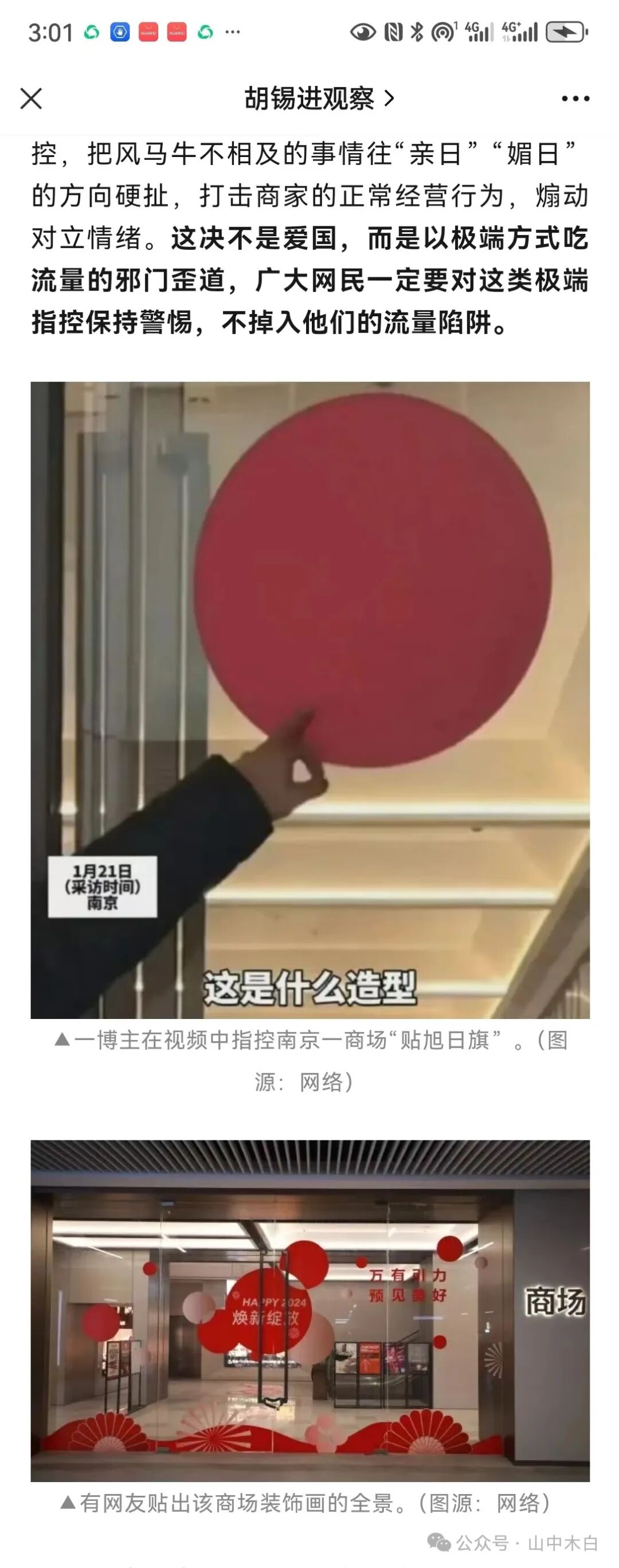 在上面胡锡进贴出的两张图片上我们可以清晰的看到,商场上原本的元素是什么?这个元素只要是上过学的朋友都该知道,每年的元旦,甚至是国庆节日,学校张贴的这些红色剪纸其实很多。红色其实是我们骨子里的元素,中国人喜欢红红火火,但就是这样的元素,从南宁到南京,被一个个指责为日本元素。如此,你是在折腾日本,还是在折腾自己人?