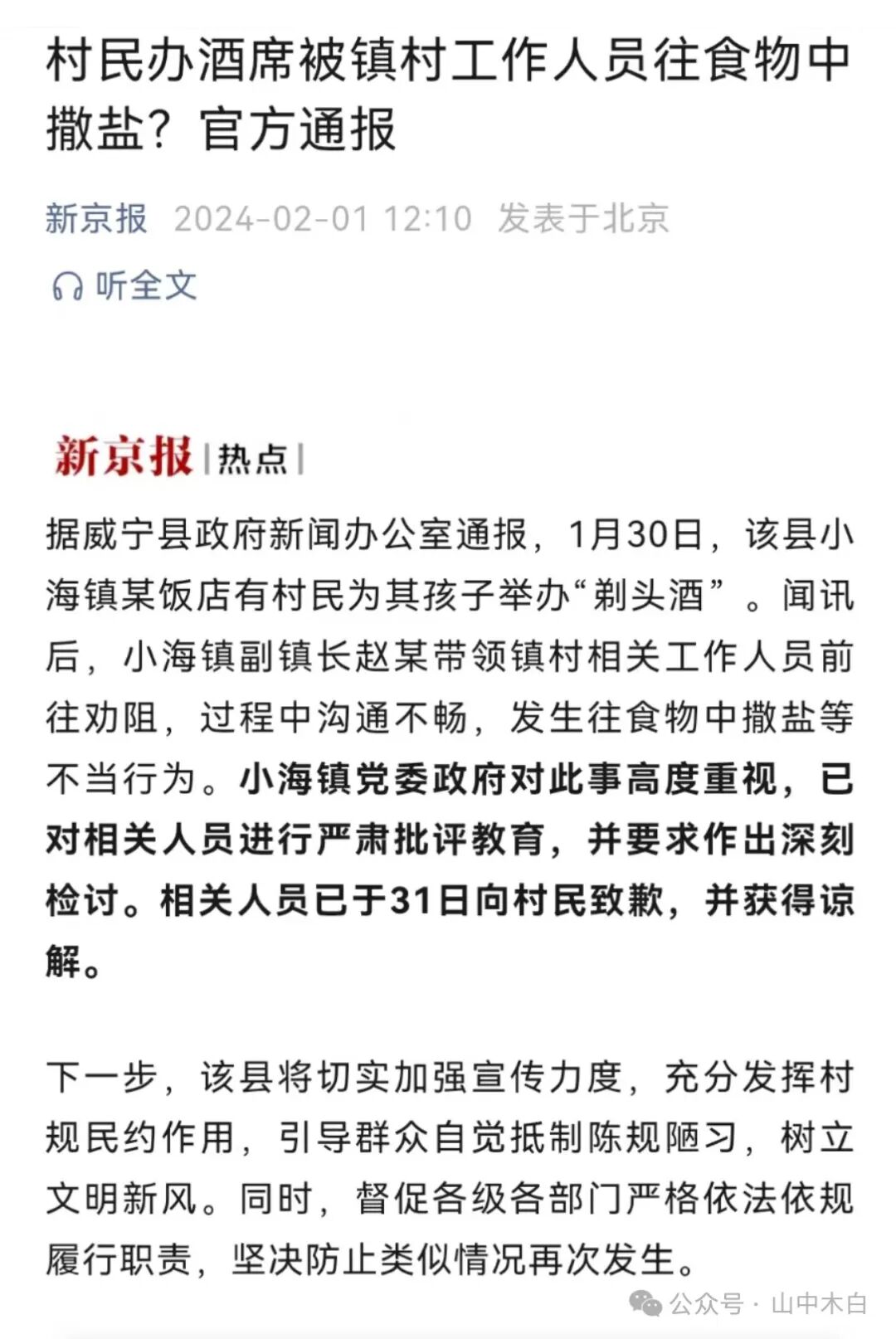 贵州某地的居民家里办酒宴,然后当地乡镇的副镇长带着一群挂着牌牌的人,到了这个办酒宴的家里,然后一人拿着一袋盐倒进这些办好的饭菜上,让人无法下咽。这种毁坏食物的现象,在网络上被抨击,尤其是那些挂着牌牌的人耀武扬威的进入居民的家内,笑着毁坏这一桌饭菜的行为,更是让人觉得遇到了流氓无赖。而且是持证上岗的那种地痞。在自家的房子内被这样欺凌,问题是他们还受法律的保护。