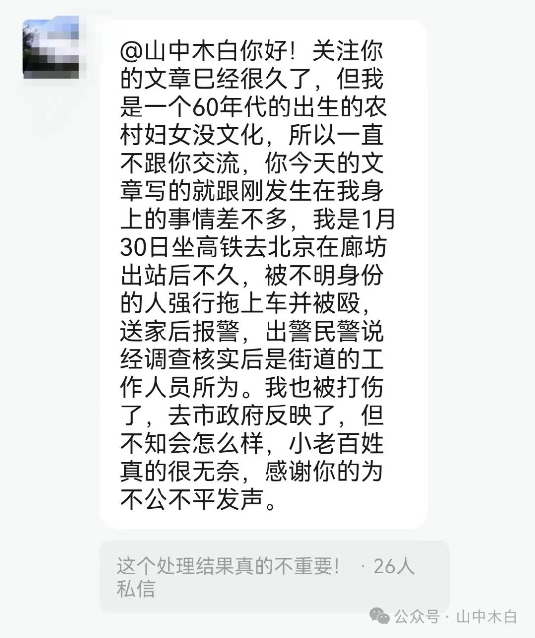 为嘛还要写,可能就是文章的善意,善是什么,是因为很多的不好事件在当下是存在着的,类似下面这位自诩为农村没文化的大姐的遭遇,在后台和私信里,昨天的文章发出来后,很多很多,不下几十个都有过这种遭遇。