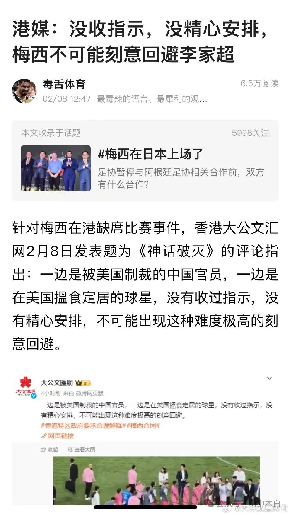 其次,争议的点,是梅西没有和香港那边的特首握手,而是故意绕过去了。对此,大公报的报道是,如果没有收到刻意的指示,没精心安排,梅西不可能刻意回避李先生!