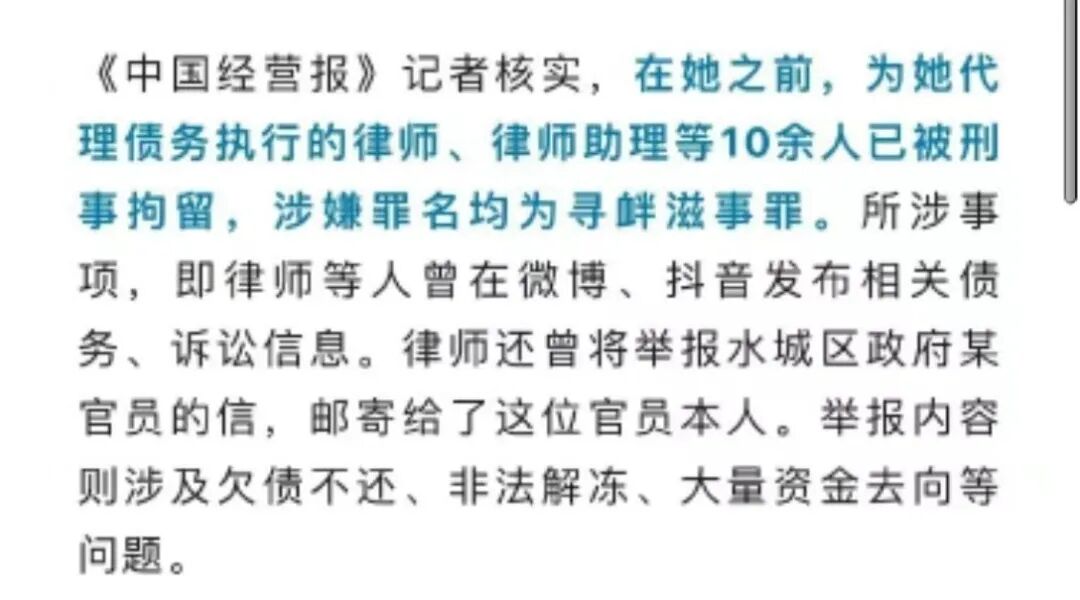 尤其是在这篇报道上,可以看到,在女企业家被寻衅滋事之前,她的律师团队已经有10余人被刑事拘留了,罪名都是寻衅滋事。原因是因为律师们通过发抖音和微博等方式,披露了相关的案件信息!