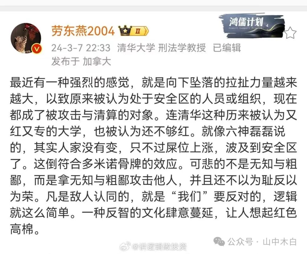 劳东燕女士说,向下坠落的拉扯力量越来越大,以致原来被认为处于安全区域的人员或组织,现在也成了被攻击和清算的对象。
