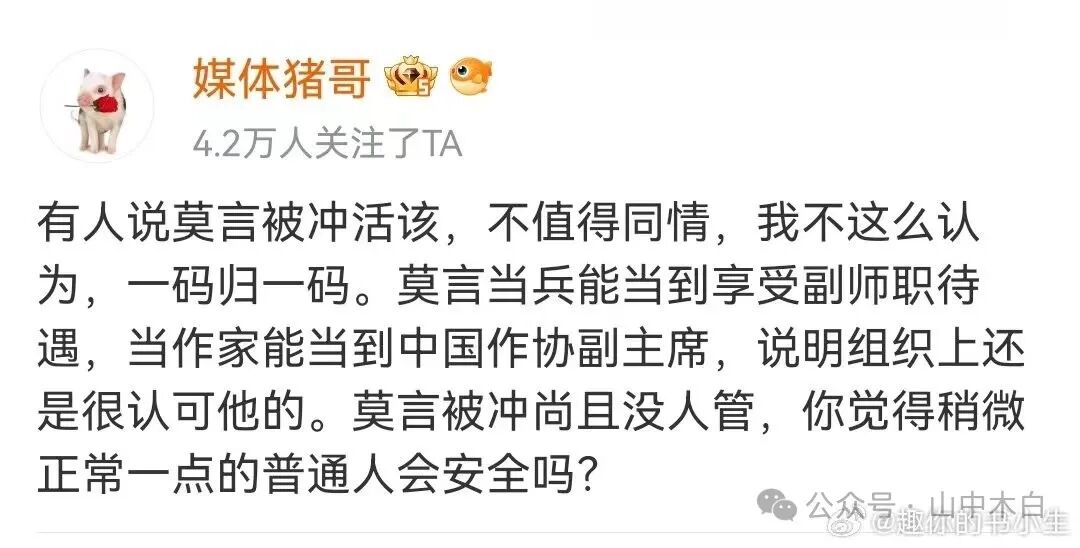 猪哥说,莫言作为中国作协xxx被冲尚且没人管,你觉得稍微正常一点的普通人会安全吗?