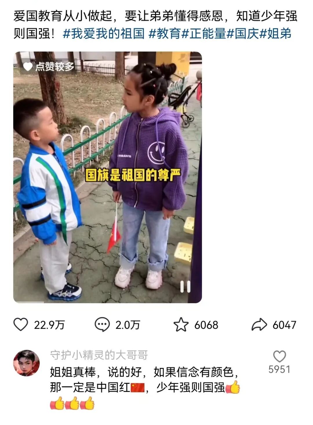 什么四岁哥哥教育弟弟勿忘国耻,娃娃们走在路上见到红色的小国旗,瞬间停下来敬礼!