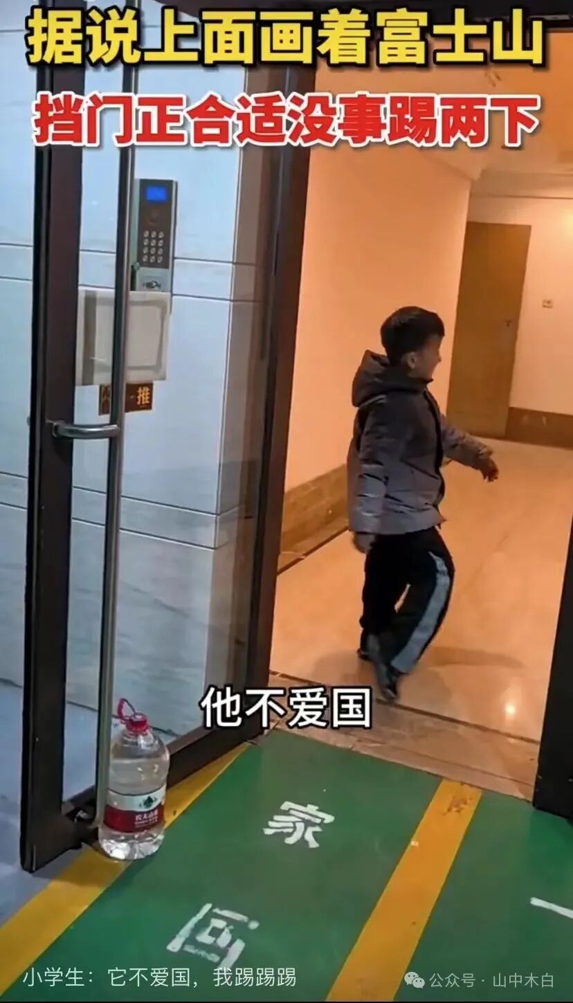 一个博士妈妈的孩子将大桶的农夫山泉挡在门口,没事踢两下,因为农夫山泉不爱国。这样的行为,没有着家长的言传身教,小孩子是不会这么憨的!