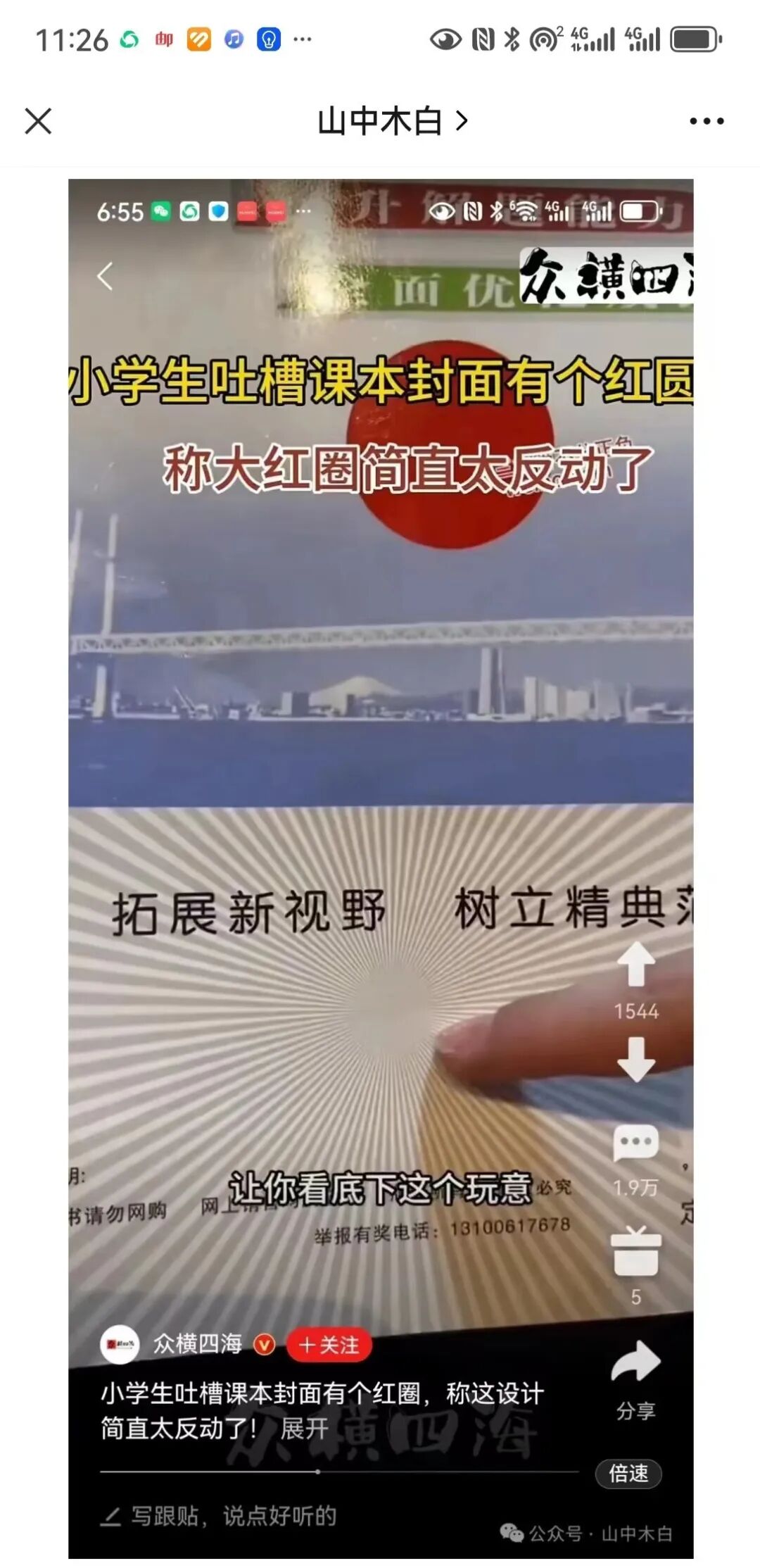 家长在那里教育着孩子,幼小的童声在那里用手指头戳着课本封面的红圈,煞有介事的喊着这红圈太反动了!而家长在一边是极尽的鼓励!