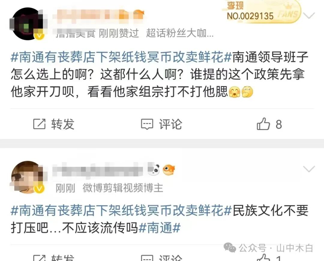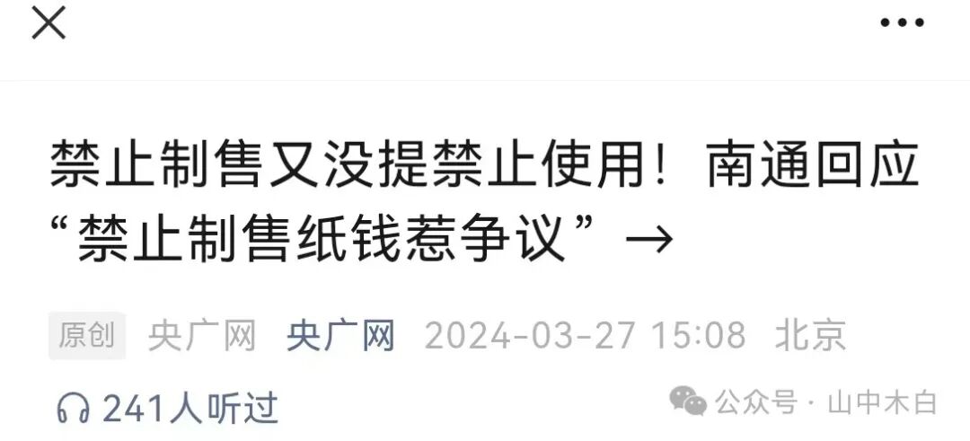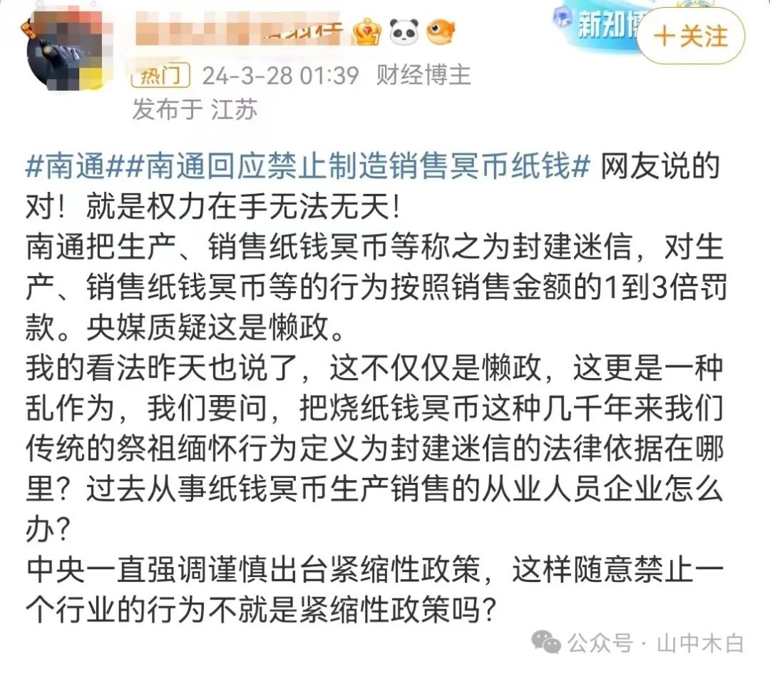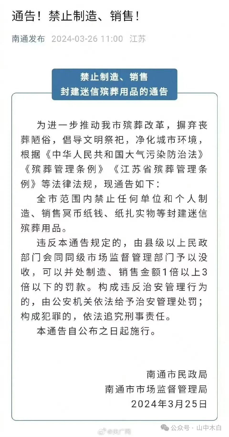 南通被骂的很惨,因为上面这一个禁止的通告,根据《大气污染防治法》,《殡葬管理条例》等法律,将在全市禁止任何单位和个人制造,销售冥币纸钱,纸扎实物等封建迷信殡葬用品。
