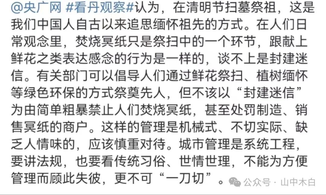 央广网对此的评论是,在清明节扫墓祭祖,这是中国人自古以来追思缅怀祖先的方式,在人们日常观念里,焚烧冥纸只是祭扫中的一个环节,跟献上鲜花之类表达感念的行为是一样的,谈不上封建迷信。