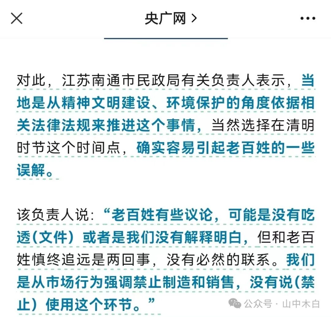 一位负责人对央视的记者说:老百姓有些议论,可能是没有吃透文件或者是我们没有解释明白,但和老百姓慎终追远是两回事,没有必然的联系。我们是从市场行为强调禁止制造和销售,没有说(禁止)使用这个环节。