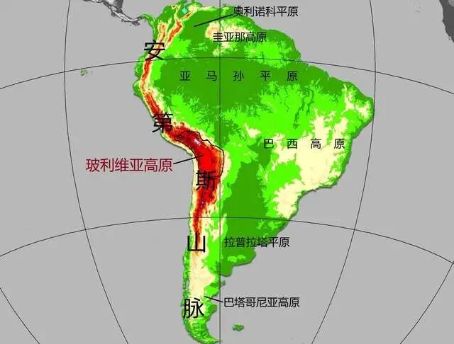 玻利维亚高原位于南美洲西部地区,由于科迪勒拉山系贯穿南北美洲,在南美洲西部形成了世界上最长的山脉安第斯山脉。玻利维亚高原就位于安第斯山脉的组成部分,也就是西科迪勒拉山脉和东科迪勒拉山脉之间,总面积约为35万平方千米,平均海拔约为3800米。由于南极洲板块(太平洋一侧)与美洲板块之间的强烈碰撞挤压,使得南美洲西侧地区隆起了巨大的海岸山脉,由于强大的挤压力,从而形成了多列褶皱山脉,而玻利维亚高原就位于这些山脉之间。