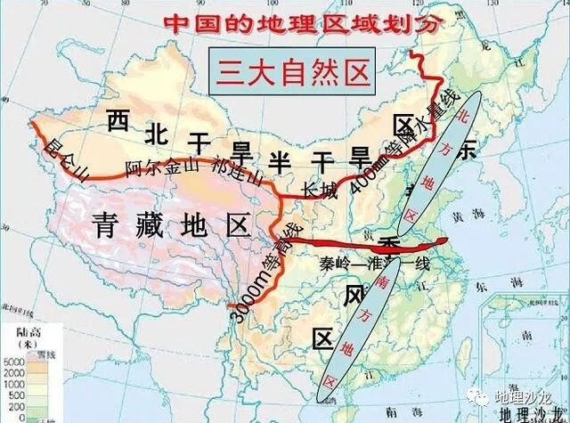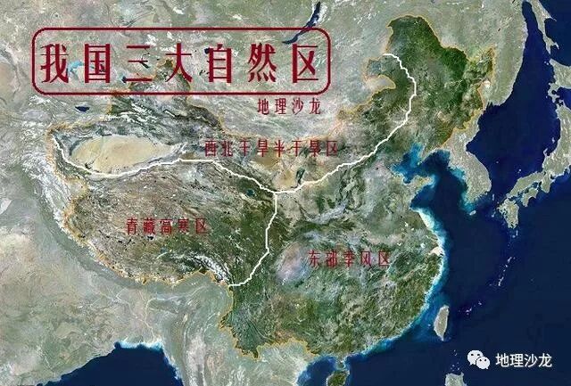 那么,如果我们要对中国的自然地理区域进行划分,可以怎样来划分呢?我们参考气候、地形、植被、水文等自然地理要素,把我国划分为三大自然区,分别是东部季风区、西北干旱半干旱区和青藏高寒区。这三大自然区的划分,特征都非常明显,东部季风区主要是指我国东部,气候上属于季风气候的区域。