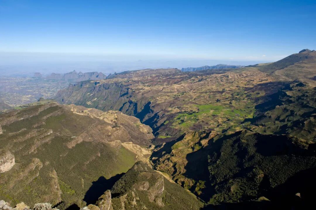 埃塞俄比亚高原是一个在古老地层上覆盖的广阔玄武岩的波状高原,在第三纪时期,该地区发生穹窿上升,从而导致地壳断裂,地下的岩浆顺着断裂带上升到地表,形成大规模的火山喷发,熔岩在地表冷却形成玄武岩,火山活动的持续,使得最终玄武岩覆盖层厚达几百米至两千米。埃塞俄比亚高原被称为“非洲屋脊”,高原上分布着一座座海拔超过4000米的火山山峰,十分宏伟壮丽。埃塞俄比亚高原由于海拔高,改变了当地的气候,形成了非洲唯一的高山气候分布区。