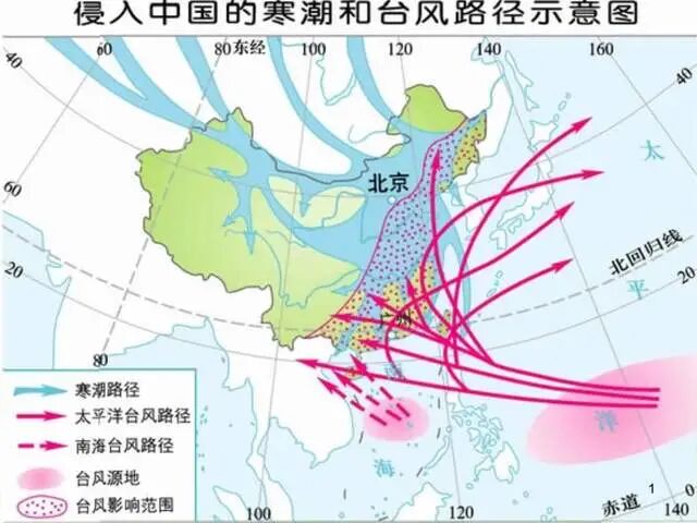 当夏季风强时,也就是副热带高压势力强时,雨带北推速度快,容易出现“南旱北涝”现象,反之,当夏季风弱时,也就是副热带高压势力弱时,雨带北推速度慢,容易出现“南涝北旱”现象。其次,夏季风带来的降水还存在巨大的年际变化,以北京为例,最多年降水量可达1409毫米,而最少年降水量仅为242毫米,高低相差五倍多,当夏季风带来的降水多的年份,容易出现洪涝灾害,反之则容易出现干旱灾害。