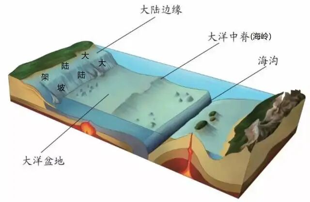 海底地形主要包括大陆架、大陆坡、海沟、洋盆和海岭等类型,海底地形的形成主要是由于板块运动造成,其中洋盆是海底地形的主体平均水深在三四千米以上,洋盆内部十分平坦开阔。海岭是海底的山脉,通常位于板块的生长边界,由于海底火山喷发而形成。海沟位于板块的消亡边界,由于海洋板块俯冲到大陆板块下方,从而形成深深的俯冲地带,也就是海沟。