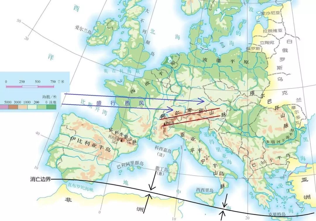 阿尔卑斯山脉是欧洲气候的重要分界线,山脉以北主要是温带海洋性气候,而山脉以南地区多为地中海气候,而控制该地区的盛行风是“盛行西风带”,阿尔卑斯山脉总体上呈东西走向,实际上是呈一定的东北西南走向,来自海洋的西风带,会在阿尔卑斯山脉的北坡(西偏北坡)受到山地地形的阻挡,而强烈的抬升,形成丰富的地形雨,在海边3000米左右形成最大降雨带,年降水量最多可以超过2000毫米。
