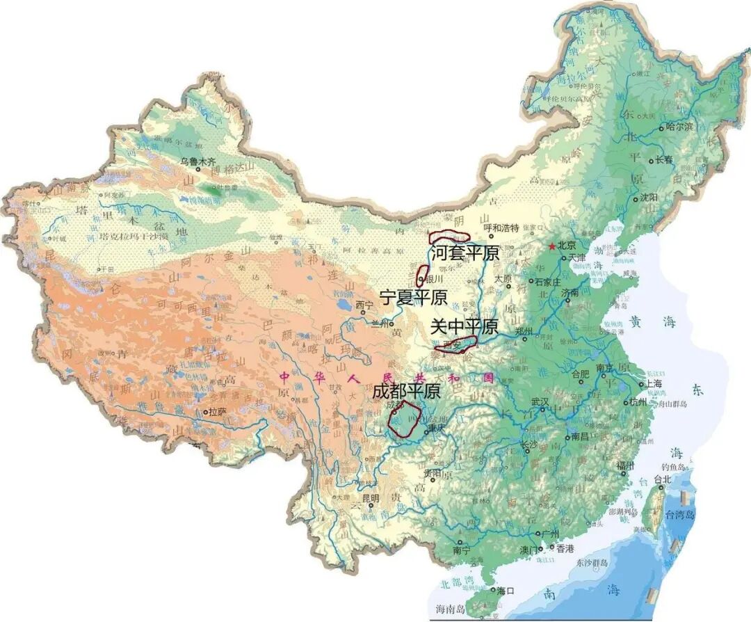 在我国东部的第三级阶梯上,除了上述三大平原外,在珠江、闽江等河流的中下游地区也多有平原分布。此外,在我国的第二级阶梯上还有一些比较有名的平原分布,不过这些地区的平原海拔多在200米以上,只是对比周边地区地势相对低平,所以习惯上也称为平原。比如位于四川盆地内部的成都平原,平均海拔在500至600米左右,被誉为“天府之国”。此外,在我国的黄河流域还分布着宁夏平原和河套平原,这两个平原利用黄河水灌溉,成为我国西北地区重要的种植业分布区,被誉为“塞上江南”。在黄河的重要支流渭河流域,还有一个由于断裂下陷加上河流泥沙沉积而形成的“关中平原”。