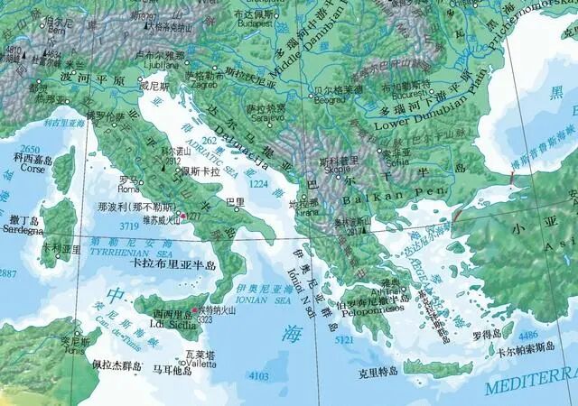 最后,是位于欧洲东南部的“巴尔干半岛”。在欧洲南部三大半岛中,巴尔干半岛的样子是最不清晰的,因为巴尔干半岛东临黑海,西靠亚得里亚海,南部濒临爱琴海,并隔土耳其海峡与亚洲的小亚细亚半岛相望,而北部巴尔干半岛有着宽阔的区域与大陆相连,这与另外两个半岛的情况很不相同。另外,巴尔干半岛的海岸线十分破碎,周边分布着数量众多的岛屿,特别是南部希腊所在的伯罗奔尼撒半岛及周边区域海岸线更为曲折,爱琴海上岛屿众多。