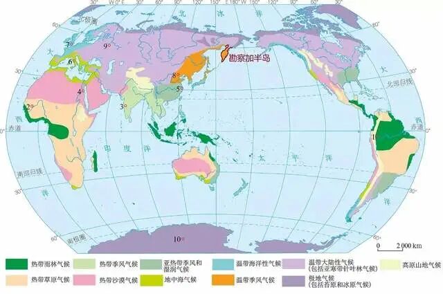 勘察加半岛的“冰”字当然主要是指半岛上的冰川和冰雪,也就是严寒的气候环境。勘察加半岛气候冬季寒冷漫长,夏季凉爽短暂,冬季最低气温可达零下50℃。造成勘察加半岛气候寒冷的原因有多方面,首先是纬度高,从热量带来看勘察加半岛地处亚寒带地区,年太阳高度角较低,获得的太阳辐射能较少。其次,太平洋沿岸的千岛寒流,起到降温减湿作用,降低了气温。