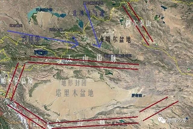 也就是说天山北坡的降水量要多于天山南坡,使得天山北坡的水分条件比南坡要好,所以生长有森林,而南坡由于水分缺乏,不足以生长森林。形成天山北坡降水较多的原因主要是,天山以北的准噶尔盆地,地形向西北开口,未完全封闭,从而使得来自大西洋的盛行西风和来自北冰洋的气流,能够顺着山口进入,向南碰到天山北坡抬升,从而形成地形雨,产生降水。而天山以南的塔里木盆地,被天山山脉和昆仑山脉包围,地形封闭,水汽难以进入,降水稀少,也就不能满足森林的生长了。